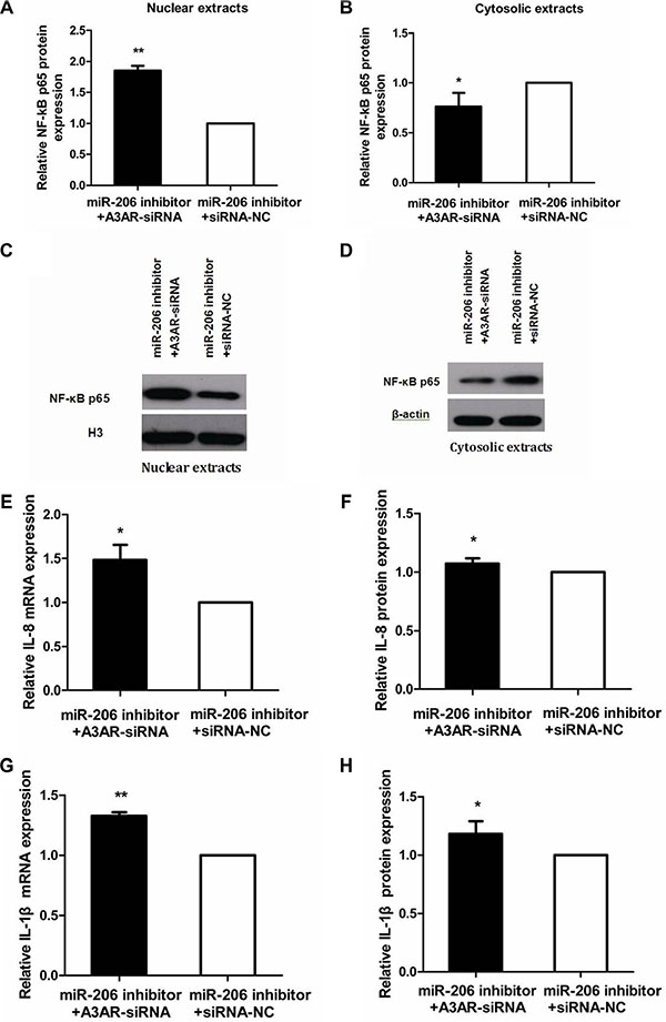 Figure 8: Reversal of miR-206-inhibitory effect by A3AR-siRNA. (A, B) Relative to siRNA-NC transfection, A3AR-siRNA transfection abrogated the miR-206-inhibitor effect on nuclear and cytoplasmic NF-κB p65 expression in TNF-α-treated cells. (C, D) Representative western blots showing NF-κB p65 expression in the indicated groups. (E–H) Relative to siRNA-NC transfection, A3AR-siRNA transfection alleviated the miR-206-inhibitor effect on IL-8/IL-1β mRNA expression and secretion in TNF-α-treated cells. Results are expressed as fold-change relative to the corresponding NC and presented as means ± SD of 3 independent experiments. *P < 0.05; **P < 0.01.