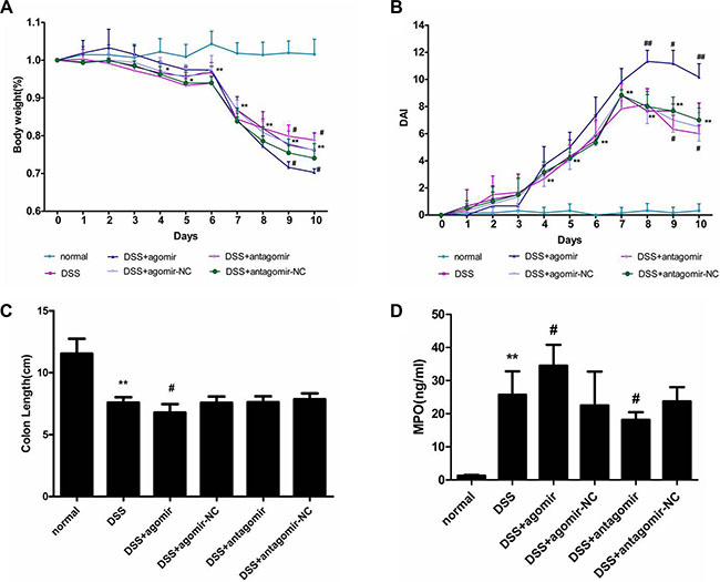 Figure 9: miR-206 increases the severity of DSS-induced colitis.(A) Bodyweight was reduced in the DSS-treated group from Day 4 onwards; bodyweight reduction was worsened and improved by miR-206 agomir and antagomir administration, respectively. (B) DAI was increased in the DSS-treated group from Day 4 onwards; DAI increase was aggravated and improved by miR-206 agomir and antagomir administration, respectively. (C) DSS treatment resulted in colon shortening in mice, and miR-206-agomir administration caused further shortening. (D) MPO activity was significantly increased in the colon of DSS-treated mice, and was significantly increased and decreased after miR-206 agomir and antagomir treatment, respectively. All data are expressed as means ± SD. **P < 0.01, DSS-treated group versus normal group; #P < 0.05 and ##P < 0.01, DSS+agomir/antagomir group versus corresponding NC group.