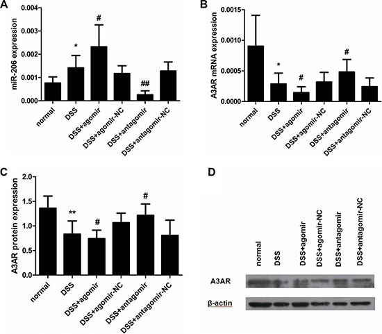 Figure 10: miR-206 downregulates A3AR expression in mouse colon. (A) miR-206 expression was higher in DSS-colitis mice than in control mice, and was upregulated and downregulated in the colon of agomir- and antagomir-treated mice, respectively, as compared with corresponding NC levels. (B, C) A3AR mRNA and protein expression was significantly decreased in DSS-colitis mice, and was significantly downregulated and upregulated after miR-206 agomir and antagomir treatment, respectively (relative to corresponding NC levels). (D) Representative western blotting showing A3AR expression following various treatments. Results are presented as means ± SD. *P < 0.05 and **P < 0.01, compared with normal group; #P < 0.05 and ##P < 0.01, compared with corresponding NC group.