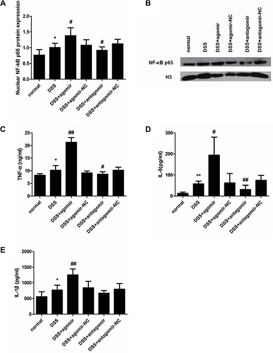Figure 11: miR-206 upregulates nuclear NF-κB p65 expression and TNF-α/IL-8/IL-1β levels in mouse colon. (A) Western-blotting analysis of nuclear NF-κB p65 expression in mouse colon. Nuclear NF-κB p65 expression was higher in DSS-colitis mice than in control mice. miR-206 agomir and antagomir treatment led to increased and decreased nuclear NF-κB p65 expression in the colon of DSS-colitis mice, respectively, as compared with corresponding NC levels. (B) Representative western blotting showing NF-κB p65 expression in the indicated groups. ELISA analysis of the expression of TNF-α (C), IL-8 (D), and IL-1β (E). TNF-α, IL-8, and IL-1β levels were significantly increased in the colon of DSS-treated mice; moreover, TNF-α, IL-8, and IL-1β expression was significantly increased after miR-206-agomir treatment, but TNF-α and IL-8 expression was decreased following miR-206-antagomir treatment (relative to corresponding NC levels). All data are expressed as means ± SD. *P < 0.05 and **P < 0.01, compared with DSS-treated group; #P < 0.05 and ##P < 0.01, compared with corresponding NC group.