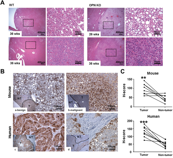 Figure 1: Histopathology and IHC for OPN. A. Hematoxylin and eosin staining in liver tissue samples from tumor-bearing WT and OPN KO mice. The boxed regions of the left panels in the WT and OPN KO samples are shown at higher magnification in the right panels. The nodules from the OPN KO mice at 26 and 36 weeks were sharply circumscribed and composed of well-differentiated tumor cells or vacuolated cells that formed trabeculae or nests, whereas the nodules from the WT mice at 36 weeks showed a sessile and solid growth pattern. B, C. IHC and quantification for OPN in mouse and human liver tissue samples. The tumor tissue samples (T) showed greater cytoplasmic expression of OPN than non-tumor tissue sample (NT) in both mouse (a, b) and human (c, d) samples. In mice, hepatocellular carcinoma (b) displayed more prominent OPN expression than hepatocellular adenoma (a). **P < 0.01 or ***P < 0.001 versus non-tumor tissue samples.