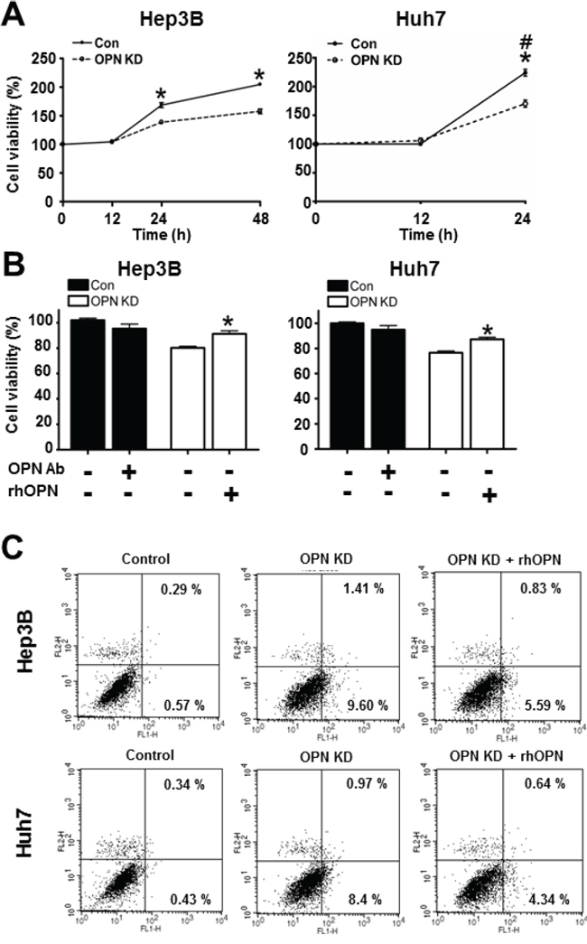 Figure 3: Effect of OPN downregulation on cell viability. A. The cell viability of Hep3B and Huh7 at each time point. OPN KD Hep3B and Huh7 at 24 hours showed lower cell viability than control cells, and the cell viability of Hep3B was also decreased by OPN suppression at 48 hours. # The cell viability of Huh7 at 48 hours was not assessed due to saturation. Results are presented as SEMs (n=6 for each time point, three independent experiments). B. Changes in cell viability according to treatment with OPN antibody (Ab) or recombinant human OPN (rhOPN). The blockade of secreted OPN by OPN Ab in control cells caused a decrease of cell viability, although statistical significance was not observed. Supplemental rhOPN in OPN KD Hep3B and Huh7 considerably increased cell viability in both cell lines. The results are presented as means ± SEMs (n=6 for each condition, three independent experiments). C. Assessment of apoptotic cell death. Early and late apoptosis (lower and upper right quadrants) were more frequently observed in OPN KD Hep3B and Huh7. Supplemental rhOPN in OPN KD Hep3B and Huh7 caused a decrease in apoptosis.
