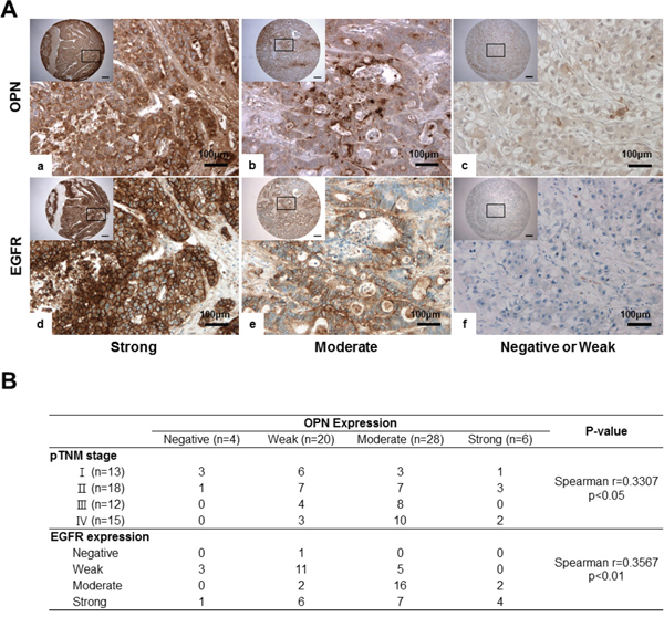 Figure 6: IHC for OPN and EGFR in human HCC tissue samples. A. Representative photomicrographs of IHC for OPN and EGFR. Serially sectioned human HCC samples showing strong (a, d), moderate (b, e) and weak expression of OPN and EGFR (c, f). Bar = 400 μm (inserts). B. Correlations among OPN expression, pTNM, stages and EGFR expression.