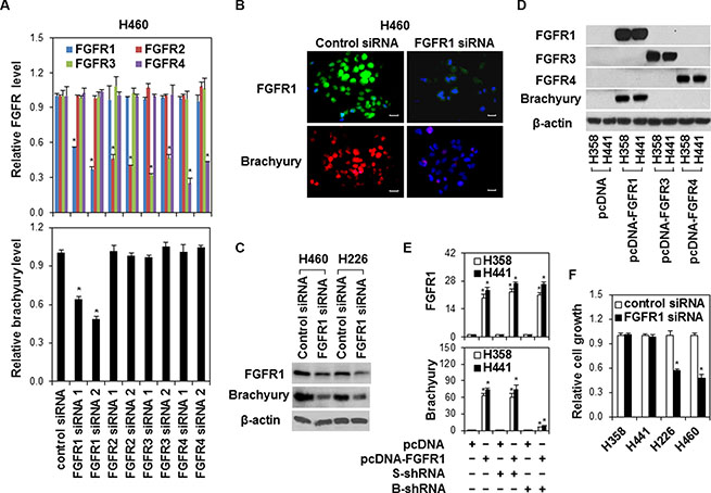 To explore the specific function of FGFR in brachyury activation in lung cancer, we silenced FGFR expressions by siRNAs in lung cancer cell line H460, which has higher endogenous FGFR and brachyury expressions (Figure 1D and 1E). We found that only FGFR1 inhibition led to suppression of brachyury in H460 cells (Figure 2A). Western blot and immunostaining assays further confirmed the inhibitory effect of FGFR1 silence on brachyury expression (Figure 2B and 2C). Considering the lower endogenous expression of FGFR1, FGFR3 and FGFR4 in human lung cancer cell line H441 and H358, we forced expression of full-length FGFR1, FGFR3 and FGFR4 in H441 cells. Only overexpression of FGFR1 induced brachyury expression (Figure 2D and 2E), and this induction of brachyury expression was blocked by shRNA mediated brachyury inhibition (Figure 2E). In addition, silencing of FGFR1 by FGFR1 siRNA only inhibited the growth of cells (H226 and H460) with higher brachyury expression (Figure 2F). These data imply that FGFR1 is a potential modulating factor of brachyury activation in lung cancer cells.