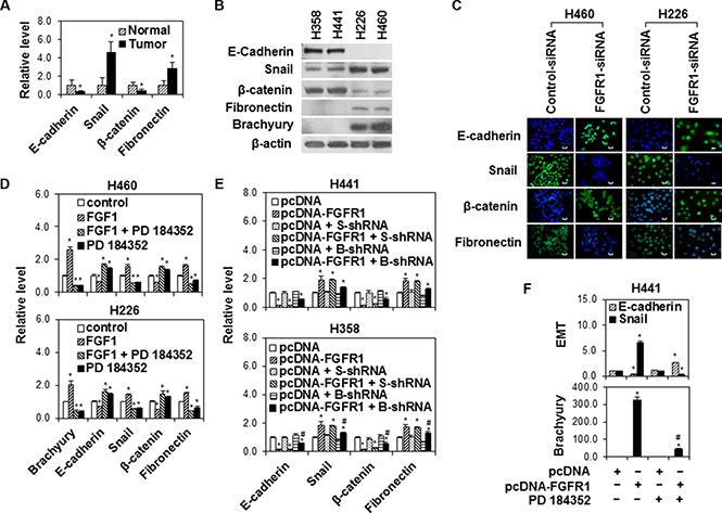 Figure 4: The modulation of brachyury-driven EMT by FGFR1/MAPK signaling in lung cancer cells. (A) Quantitative RT-PCR analysis of E-cadherin, Snail, β-catenin and fibronectin mRNA expression in human lung adenocarcinoma tissues and adjacent normal lung tissues. Data were presented as mean ± SD (n = 25). *P < 0.05, vs normal tissues. (B) H358, H441, H226 and H460 cells were seeded in 6-well plates at density of 2 × 105 cells per well for 24 h. Cell protein extracts were used for Western Blot analysis of E-cadherin, Snail, β-catenin, fibronectin and brachyury. Representative bands from three independent experiments with similar results are shown. (C) Immunofluorescence staining for E-cadherin, Snail, β-catenin and fibronectin (green) in H460 and H226 cells after transfection with control siRNA or FGFR1 siRNA (FGFR1 siRNA 2) for 48 h. Nuclei was counter-stained with DAPI (blue). Scale bars = 50 μm. Representative images from three independent experiments are shown. (D) H460 and H226 cells were seeded in 6-well plates at density of 2 × 105 cells per well for 24 h, then cells were starved overnight and treated with FGF1 (10 ng/ml) for 24 h followed by PD 184352 treatment (1 μM) for 1 h. Quantitative RT-PCR assay was used to measure brachyury, E-cadherin, Snail β-catenin and fibronectin expressions. *P < 0.05, vs control (untreated). (E) H441 and H358 cells stably expressing pcDNA or pcDNA -FGFR1 were transfected with scramble shRNA (S-shRNA) or brachyury shRNA (B-shRNA) for 24 h. Quantitative RT-PCR assay was used to measure E-cadherin, Snail, β-catenin and fibronectin expressions. Data were presented as mean ± SD (n = 3). *P < 0.05, vs pcDNA alone; #P < 0.05, vs pcDNA-FGFR1 alone. (F) H441 cells stably expressing pcDNA or pcDNA-FGFR1 were treated with PD 184352 (1 μM) for 24 h. E-cadherin, Snail and brachyury expressions were measured by Quantitative RT-PCR assay. Data were presented as mean ± SD (n = 3). P < 0.05, vs pcDNA alone.