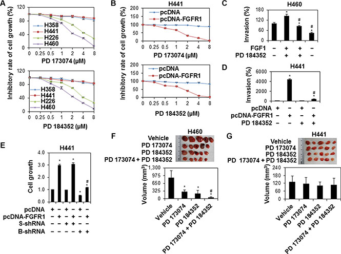 Figure 5: The suppressed lung cancer cell growth and invasion by inhibition of FGFR/MAPK/brachyury signaling. (A) Human lung cancer cell lines H358, H441, H226 and H460 were treated with PD 173074 or PD 184352 at the indicated doses for 48 h. Cell growth was measured by MTS. Data were presented as mean ± SD (n = 5). (B) H441 cells stably expressing pcDNA or pcDNA-FGFR1 were treated with PD 173074 or PD 184352 at the indicated doses for 48 h. Cell growth was measured by MTS. Data were presented as mean ± SD (n = 4). *P < 0.05, vs pcDNA at the same dose of treatment. (C) H460 cells were pretreated with MAPK inhibitor, PD 184352 (1 μM) for 1 h after starving overnight, following an incubation with FGF1 (10 ng/ml) for 24 h. Cell invasion was measured by BD matrigel invasion assay. The y-axis represents a percent change over serum-free control. Error bars indicate SEM (n = 4). (D) H441 cells stably expressing pcDNA or pcDNA-FGFR1 were treated with PD 184352 (1 μM) for 48 h. Cell invasion was measured by BD matrigel invasion assay. *P < 0.05, vs pcDNA at the same dose of treatment. #P < 0.05, vs FGF1+ PD 184352. Data were presented as mean ± SEM (n = 4). for cells stably expressing pcDNA alone). (E) H441 cells stably expressing pcDNA or pcDNA-FGFR1 were transfected with scramble shRNA or brachyury shRNA for 48 h. Cell growth was measured by MTS. Data were presented as mean ± SD (n = 4). *P < 0.05, vs control (untreated for cells stably expressing pcDNA alone). #P < 0.05, vs PD 184352. (F and G) Antitumor activity of PD 173074 or/and PD 184352 in lung cell line xenografts. H460 (F) and H441 (G) cells were implanted into the flank of nude mice. PD 173074 or/and PD 184352 or vehicle (buffer) i.p treatment were administered daily (n = 5 per group). Tumor volumes were measured at 12 d after initiation of treatments. Top: Samples of lung tumors in different treatment groups. Bottom: The volume of tumor which regressed with PD 173074 or/and PD 184352 treatment. Data were presented as mean ± SD (n = 5). *P < 0.05 vs vehicle. #P < 0.05, vs PD 173074 or PD 184352 alone.