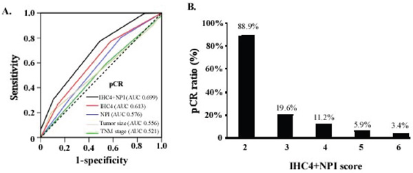 In summary, we developed and validated a new predictive biomarker named NPI+IHC4 in predicting pCR following NAC in ER+ breast cancer patients and demonstrated that NPI+IHC4 outperformed NPI or IHC4 score alone and other clinicopathological factors in predicting pCR.