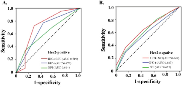 Figure 2: Predictive value of NPI+IHC4 scoring system, IHC4 score and NPI in subgroups stratified by Her2. A. Her2-positive; B. Her2-negative.