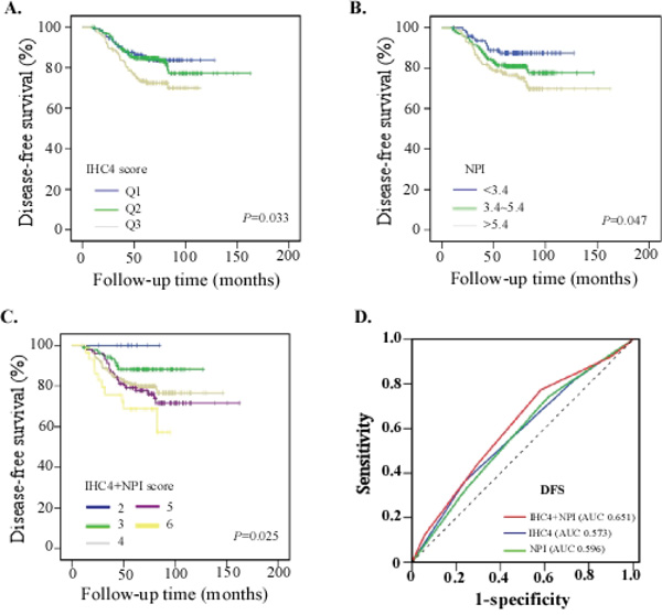 Compared with the non-pCR patients, the patients with a pCR had a longer disease-free survival (DFS) (P=0.048) (Supplementary Figure S2). In this study set, both IHC4 score, NPI score and NPI+IHC4 score were associated with DFS. The patients with lower IHC4 score (P=0.033), NPI (P=0.047) and NPI+IHC4 (P=0.025) score had significantly better DFS (Figure 3A-3C). ROC analysis showed that the prognostic value for DFS of NPI+IHC4 (AUC 0.651) was better than IHC4 score (AUC 0.573) or NPI alone (AUC 0.596) (Figure 3D).