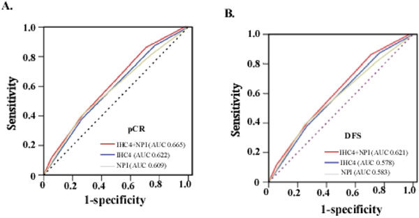 Figure 4: Comparison of predictive value and prognosis accuracy of NPI+IHC4, IHC4 and NPI in validation set. A. Predictive value for pCR; B. Prognostic accuracy for DFS.