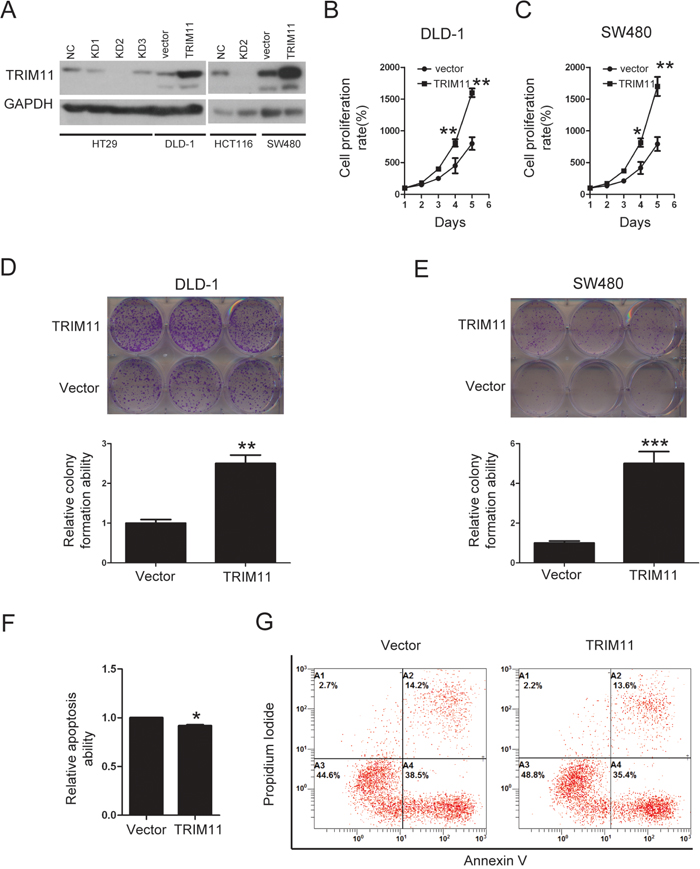 Figure 4: Overexpression of TRIM11 promotes CC cell proliferation and inhibits cell apoptosis. A. The generation of stable cell lines in which TRIM11 was overexpressed or silenced was confirmed by western blotting. GAPDH was used as the internal control. B, C. The cell proliferation of the indicated stable cell lines in vitro was measured at different time points, as indicated by the CCK-8 assay. The bars correspond to the mean± standard error, and the P value was calculated using Student’s t-test. *P<0.05, **P<0.01. D, E. The colony formation of the indicated stable cell lines in vitro was measured for 14 days. The bars correspond to the mean± standard error, and the p-value was calculated using Student’s t-test. **P<0.01,***P<0.001. F, G. The stable cell lines overexpressing the empty vector or TRIM11 were treated with 150 μg/ml5-FU for 24 h and then subjected to annexin V-FITC and PI staining. Cell apoptosis was evaluated through FACS. The bars correspond to the mean± standard error (n = 3), and the P-value was calculated using Student’s t-test. *P<0.05.