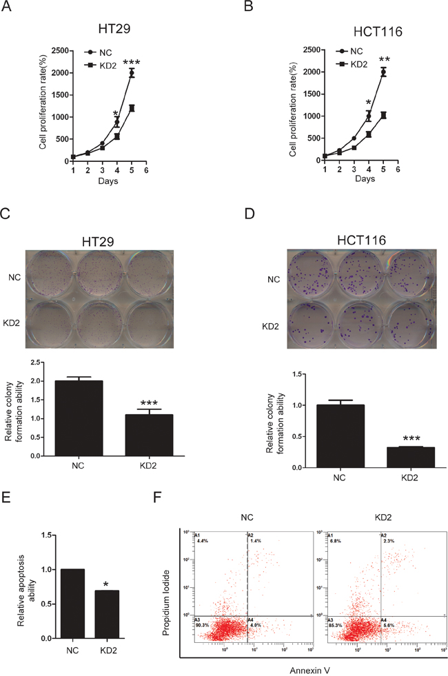 The ability to knock out genes by CRISPR/Cas9 mediated genome editing is revolutionizing modern genetics [24]. We constructed three sgRNAs targeting different regions in one of the first few exons of the human TRIM11 gene, using bioinformatics prediction to avoid obvious potential off-target effects [25]. Western blotting showed that only sgRNA#2(KD2) efficiently knocked down TRIM11 in HT29 and HCT116 cells (Figure 4A). During cell culture, we noticed that KD2 cells proliferated more slowly than the control counterpart. Furthermore, CCK-8 assay indicated that silencing TRIM11 significantly suppressed cell proliferation (Figure 5A and 5B). The colony formation assay showed that silencing TRIM11 decreased colony formation ability (Figure 5C and 5D). Furthermore, the propidium iodide-annexin V assay revealed that knockdown of TRIM11 increased the apoptosis rate after treating with 5-FU for 24 hours (Figure 5E and 5F). Collectively, our result suggests that reduced TRIM11 suppresses CC cell proliferation and induces apoptosis in vitro.