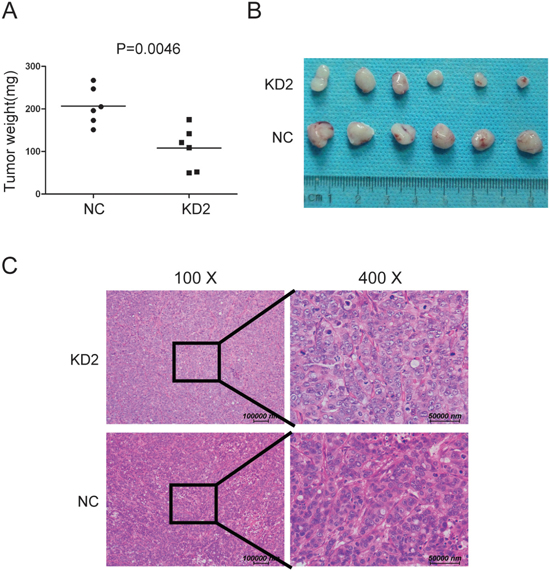 Figure 6: Silencing TRIM11 reduces tumor growth in vivo. A. Tumor weights for the tumors formed by the indicated cells (p=0.0046). B. Representative images of the tumors from all the mice in each group. C. H&E staining representative images of tumor formed by KD2 and NC cells.