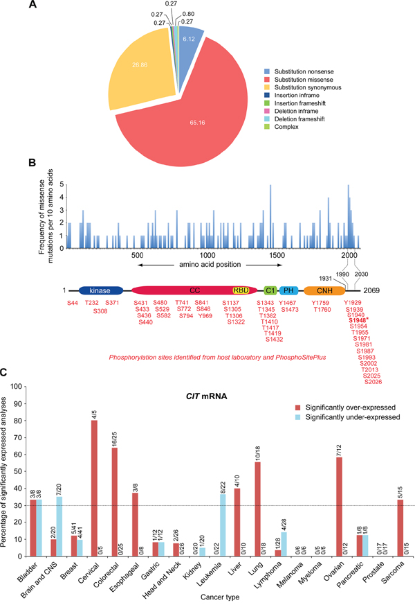 Figure 1: Cancers display even distribution of somatic mutations across the CIT gene and predominately over-express CIT mRNA. A. CIT point mutations identified from the COSMIC database (gene ID: CIT_ENST00000261833) were categorized into types of mutations. The percentage each mutation type contributes is noted within each segment. B. CIT substitution missense mutations across the gene were calculated and mapped per 10 amino acids. A schematic representation of CIT-K is shown below the mutation histogram to visualise the location of the mutations. Phosphorylation sites identified from our laboratory and PhosphoSitePlus are listed below the CIT-K protein structure. S1948 is in bold and indicated by an asterisk to highlight that it was found mutated in the COSMIC database. CC, coiled coil; RBD, Rho/Rac binding domain; C1, cysteine-rich motif; PH, pleckstrin homology; CNH, Citron-NIK homology. C. CIT mRNA from cancerous tissue was datamined from the Oncomine™ database and compared against corresponding normal tissues to observe any over- or under-expression. All of the datasets on Oncomine™ were included in the analysis, whether they showed a significant (p < 0.001) difference in CIT mRNA expression or not. The bars show how many datasets showed either significant over- or under-expression, with the numbers above each bar indicating exactly how many of those datasets demonstrated a significant difference.