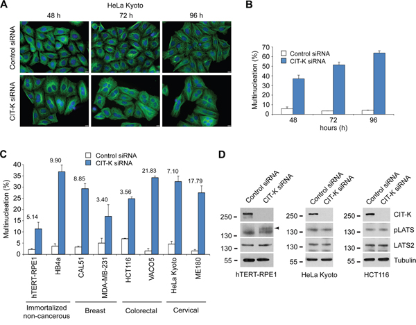 The discovery and validation of new targets for the treatment of cancers is essential for improving patient survival. Here we investigated the potential of inducing cytokinesis failure via depletion of CIT-K as an anti-proliferative anti-cancer approach in breast, cervical and colorectal cancers. Our results indicate that CIT-K is essential for cytokinesis in all cancer cell lines, which contrasts with the evidence that in CIT-K null mice cytokinesis failure was only observed in brains and testes [28, 29]. It is therefore likely that CIT-K is necessary for cytokinesis across a wider range of human tissues than initially anticipated from studies in mice. These findings also suggest that, notwithstanding the high level of sequence conservation between mice and human genes, their functions and requirement can differ in the two organisms and caution should be taken in assuming that knowledge gained from studies in mice could be directly transferred to human systems.