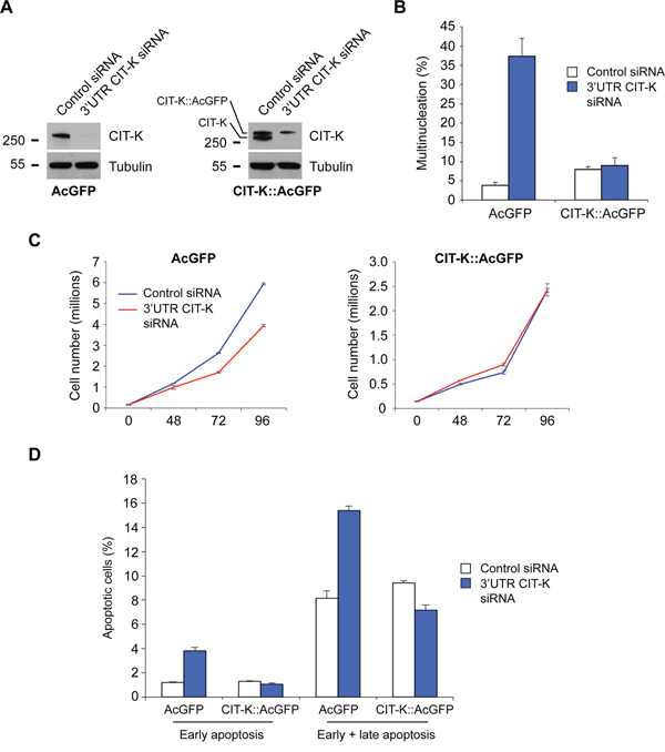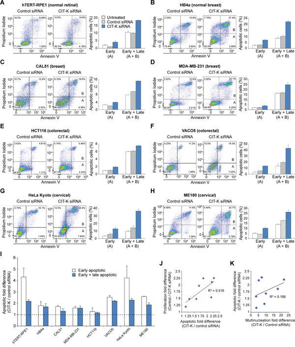 We analyzed the effects of depleting CIT-K through RNA interference (RNAi) in a panel of cancer cell lines originating from breast, colorectal and cervical tissues. We found that, in all cell lines, CIT-K depletion caused cytokinesis failure, which decreased cell proliferation and triggered apoptosis via activation of executioner caspase 7. We also investigated why certain cancer cell lines elicited different sensitivities to CIT-K depletion and found that actively dividing cells and, to some extent, polyploid cells were significantly more sensitive to cytokinesis failure. These findings position CIT-K as a promising anti-proliferative target for the potential treatment of a wide range of cancers characterized by active cell proliferation and polyploidy.
