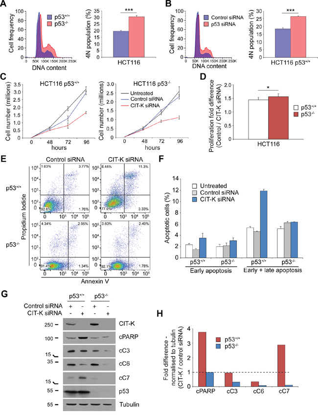 Taken together, all these results indicate that CIT-K depletion was particularly effective in blocking the proliferation of polyploid and actively dividing cells, irrespective of the level of CIT-K expression, p53 status and CIN.