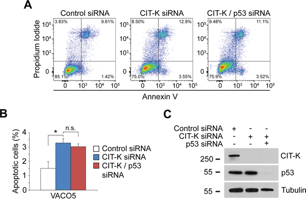 The following siRNAs were used: scrambled sequence control – 5’-AACGUACGCGGAAUACUUCGA-3’, CIT-K – 5’-AUGGAAGGCACUAUUUCUCAA-3’, 3’UTR CIT-K – 5’-CACACUAUGGAACUCUGCU-3’, TP53 – a pool of siRNAs were purchased from Dharmacon. All siRNAs were transfected at a concentration of 12 nM using lipofectamine RNAiMAX (Thermo Fisher Scientific) following the manufacturer’s instructions, where cells were then washed with PBS and maintained under normal culture conditions for the specified time.
