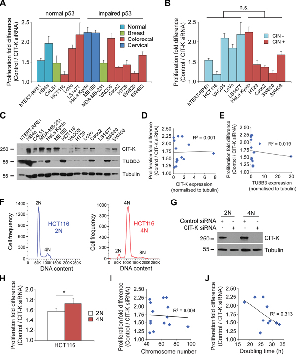Figure 9: Tetraploid cells are more sensitive to the depletion of CIT-K compared to their diploid counterparts. A. Cell lines listed were treated with control or CIT-K siRNA for 96 h, cell number calculated and the fold difference between control and CIT-K siRNA-treated cells quantified. For each condition n=3, with the experiment performed in triplicate (pooled data, n=9), error bars represent SEM. The cell lines are sorted into having normal or impaired p53 functions. B. Cells listed were treated as described in A, but were characterized depending on whether they possessed CIN (+) or not (-). C. Protein extracts of all the cell lines tested were analyzed by Western blot to detect CIT-K, TUBB3 and tubulin. The numbers on the left indicate the sizes in kilodaltons of the molecular mass marker. D. Correlation analysis of proliferation fold difference and CIT-K expression (from C, CIT-K normalized to tubulin) of each cell line. The Pearson correlation coefficient (R2) is listed next to the linear trend line. E. Correlation analysis of proliferation fold difference and TUBB3 expression (from C, CIT-K normalized to tubulin) of each cell line. F. HCT116 2N and 4N cells were fixed in 70% ethanol and treated with PI/RNase solution to detect DNA content. 50,000 cells were used for each analysis. G. HCT116 2N and 4N cells were treated with either control or CIT-K siRNA for 48 h, harvested and protein extracts analyzed by Western blot to detect CIT-K and tubulin. The numbers on the left indicate the sizes in kilodaltons of the molecular mass marker. H. HCT116 2N and 4N cells were treated with either control or CIT-K siRNA for 48 h, counted and the fold difference between control and CIT-K siRNA-treated cells quantified. For each condition n=9, *p < 0.05 (Student’s t-test), error bars represent SEM. I. Correlation analysis of proliferation fold difference and chromosome number of each cell line. J. Correlation analysis of proliferation fold difference and doubling time of cell lines. The values used for D, E, I and J can be found in Table 1.