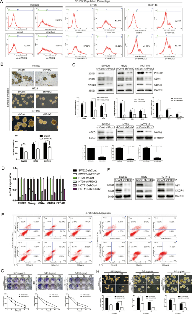 Figure 2: Prdx2 knockdown results in a reduction in stemness properties of colon cancer cells. A. The percentage of CD133+ cells in stably-transduced shCont and shPrdx2 SW620, HT29, and HCT116 cell lines was analyzed by flow cytometry. B. Prdx2-depleted and control cells were subjected to sphere formation assays in ultra-low-attachment 6-well plates. The numbers of spheroids generated per 10,000 cells were counted 14 days after seeding. *p< 0.05, **p< 0.01. C. The protein levels of Prdx2, CD44, CD133, and Nanog in stably-transduced shCont and shPrdx2 SW620, HT29, and HCT116 cell lines were detected by Western blot analysis. *p< 0.05, **p< 0.01. D. The mRNA levels of Prdx2, CD44, CD133, EPCAM and Nanog in stably-transduced shCont and shPrdx2 SW620, HT29, and HCT116 cell lines were detected by quantitative polymerase chain reaction. E. CD133+ cells sorted from HT29 and HCT116 cells with and without Prdx2 depletion were treated with 5-fluorouracil for 48 h, and apoptosis levels were then detected by flow cytometry. F. The protein levels of Lgr5, and CXCR4 in stably-transduced shCont and shPrdx2 SW620, HT29, and HCT116 cell lines were detected by Western blot analysis. G. Lv-shPRDX2 and Lv-shCont transfected cells were treated with the indicated concentrations of 5-FU for 8 days and subjected to clonogenic cell survival assay. Quantitation of clonogenic cells from three independent experiments is shown. *p< 0.05. H. Lv-shPRDX2 and Lv-shCont transfected cells were treated with the indicated concentrations of 5-FU for 14 days and subjected to clonogenic spheres survival assay. Quantitation of clonogenic spheres from three independent experiments is shown. *p< 0.05.