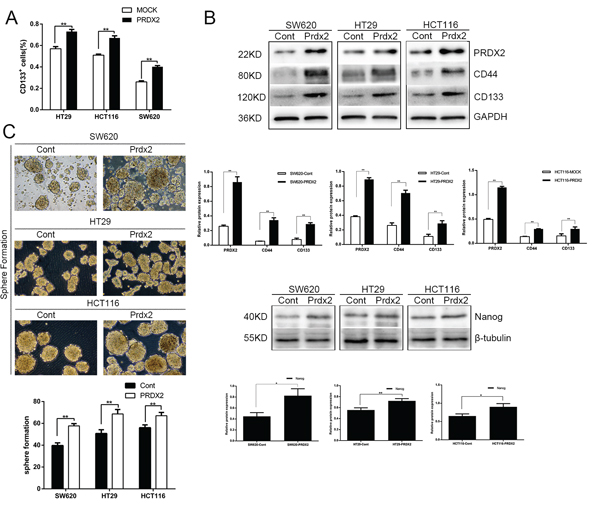Figure 3: Prdx2 promotes the stemness and survival of colon cancer stem cells. A. The percentage of CD133+ cells in Prdx2-overexpressing and control colon cancer cells was determined by flow cytometry. *p< 0.05, **p< 0.01. B. The increase in CD44, CD133, and Nanog protein expression in response to overexpression of Prdx2 in SW620, HT29, and HCT116 cells was assessed by Western blot analysis. *p< 0.05, **p< 0.01. C. Prdx2-overexpressed and control cells were subjected to sphere formation assays in ultra-low-attachment 6-well plates. The number of spheroids generated per 10,000 cells was counted 14 days after seeding. *p< 0.05, **p< 0.01.