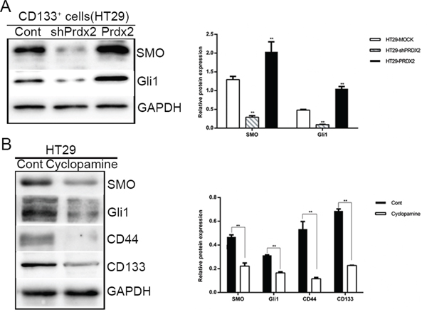 Hh/Gli1 pathway plays an important role in CSC biology. In our study, Prdx2, SMO, Gli1, and CD133 expression was verified in the colon cancer cell lines. Knockdown or overexpression of Prdx2 markedly reduced or increased, respectively, SMO and Gli1 protein expression in the CD133+ cells sorted from the HT29 cells (Figure 6A). When the Hh pathway was inhibited in HT29 cells with the SMO inhibitor cyclopamine, reduced expression of stemness markers, such as CD44 and CD133, was observed (Figure 6B), suggesting that Prdx2 may promote CSC-associated properties in colon cancer via the Hh/Gli1 signaling pathway.