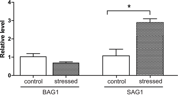 Figure 1: Relative expression levels of BAG1 and SAG1 in the brains of chronically infected mice before and after transportation stress. The T. gondii PRU strain was used to infect Kunming mice, six weeks post infection, chronically infected mice were placed under conditions mimicking transportation stress for 3 days (no treatment as negative control, 3 mice each group). Subsequently, total RNA was extracted from mice brains and RT-PCR was used to determine the mRNA levels for BAG1 and SAG1. β-tubulin was used as internal control. Means ± SD from three independent experiments were graphed, *P <0.05, student's t-test.
