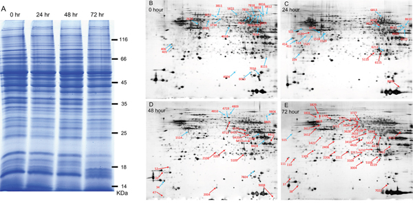 Figure 4: Two-dimensional gel electrophoresis to identify differentially expressed proteins during transportation stress induced activation of chronic infection. Total proteins were extracted from T. gondii cysts (also contained host materials) of chronically infected mice underwent transportation stress for indicated amount of time and subsequently used in 2D gel electrophoresis. A. SDS-PAGE analysis to check the quality of protein samples extracted from brain cysts. Protein samples (20 μg each) were separated on 8% SDS-PAGE gel and stained with coomassie blue. B-E. Two-dimensional gel electrophoresis of protein samples in (A). A total of 150 μg proteins from each sample were first separated by isoelectric focusing electrophoresis and subsequently by SDS-PAGE, stained with sliver nitrate, scanned to determine the intensity of each spot. Proteins in the 24, 48 and 72 hour samples with abundance higher than 2 fold (up-regulated) or less than 50% (down-regulated) compared with the 0 hour sample (no stress) were identified and indicated (blue arrows indicate down-regulated proteins and red arrows indicate up-regulated ones). Experiments were repeated three times independently and only the ones with significant difference were marked on these representative gels.
