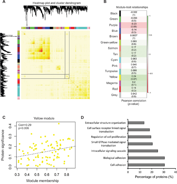 Figure 4: Network analysis of protein content with vesicle secretion. A. Network heatmap plot of topological overlap depicting protein dendrogram and module assignment. Targeted yellow module is highlighted. See also Supplementary Figure 3. B. Heatmap of module-trait correlation containing correlation and relevant p-values of modules detected. See also Supplementary Table S7 and S8. C. Scatter plot of membership in the yellow module and protein significance corresponding to vesicle secretion quantities across the NCI-60. A significant positive correlation between protein significance and module membership was determined (p = 0.006). D. GOTERM_BP_FAT analysis of biological processes enriched in the yellow module protein dataset.