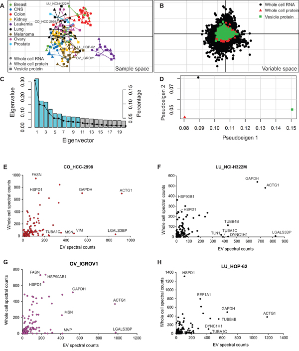 Co-inertia analysis (CIA; [66, 67]) was used to examine similarities between the vesicle proteome and cellular proteome and transcriptome across the NCI-60 cell lines. Microarray gene expression data was downloaded from the NCBI Gene Expression Omnibus [68] (accession number GSE32474; [69, 70]). Whole-cell proteome data was obtained from the NCI60 proteome resource (http://proteomics.wzw.tum.de/nci60; [28]). Spectral count data from the whole-cell dataset was processed analogously to the EV proteome dataset for comparability: raw spectral count data published by Moghaddas Gholami et al. were normalized with DESeq2 following removal of all proteins not found with at least one count in 40 or more samples, and further transformed with the VST function. NCI-60 cell lines not included in all three datasets were excluded from this analysis, leaving 56 samples in total. Differences between samples and molecular assays were analyzed and visualized with co-inertia analysis using the R omicade4 package [71] in the R statistical framework.