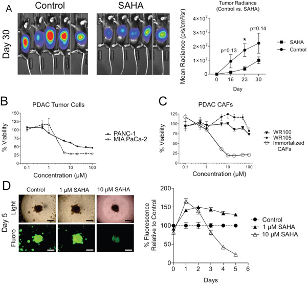 Figure 1: Effect of HDAC inhibition on PDAC tumor cell viability in isolation and in 3D co-culture with CAFs. A. KPC-luc cells were implanted in the pancreata of C57BL/6 mice and mice were treated with oral gavage of SAHA 5 times weekly beginning on Day 7. Luminescence measurements were measured on days 16, 23, and 30 in SAHA treated and control mice. Error bars represent SEMs. *P < 0.05. B. MTT assay of PANC-1 and MIA PaCa-2 PDAC tumor cell viability at various doses of SAHA for 96h. C. MTT assay of WR100 and WR105 primary PDAC fibroblasts and immortalized CAFs at various doses of SAHA for 96h. D. Images of PANC-1-GFP/PDAC fibroblast co-culture under fluorescence and light microscopy (left) (4X; scale: 300 μm) and 5 day time course of relative fluorescence of PANC-1-GFP/PDAC CAF co-cultures with treatment of SAHA. Fluorescence is normalized to untreated control cell co-cultures.