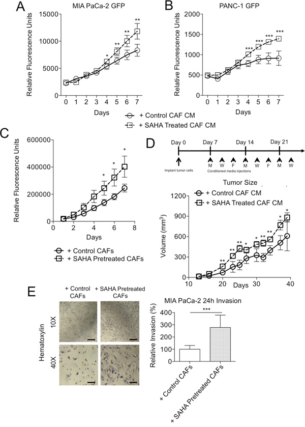 Figure 2: HDACi-treated fibroblasts enhance tumor cell malignant phenotypes. Fluorescence measurements of A. MIA PaCa-2-GFP and B. PANC-1-GFP cells cultured with conditioned media (without drug) from CAFs pre-treated with or without SAHA for 7 days. C. Fluorescence measurements of PANC-1-GFP 3D co-cultured (without drug) for 7 days with CAFs pre-treated +/- SAHA. D. Schematic of in vivo experimental design (above) and tumor volume (below) of subcutaneous flank MIA PaCa-2 tumors of 8 tumors per group injected thrice weekly with conditioned media from cultured CAFs +/- SAHA. *P < 0.05, **P < 0.01. E. Light microscopy images (left) (10X; scale: 100 μm, 40X; scale 10 μm) and relative invasion (right) of MIA PaCa-2 invasion with control or 10 μM SAHA pre-treated PDAC CAFs after 24h in a modified Boyden chamber. *P < 0.05, **P < 0.01, ***P < 0.001.