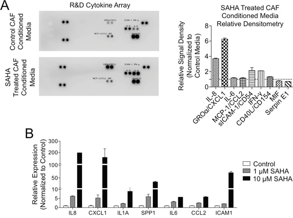 Figure 3: HDACi treatment increases secretion of tumor supportive pro-inflammatory mediators in PDAC CAFs. A. Secretion of pro-inflammatory cytokines was assessed after 24h in control and 10 μM SAHA treated CAFs by cytokine array (left) with relative densitometry measurements (right). B. Gene expression of inflammatory mediators was determined by qRT-PCR in PDAC CAFs treated for 24h with SAHA.