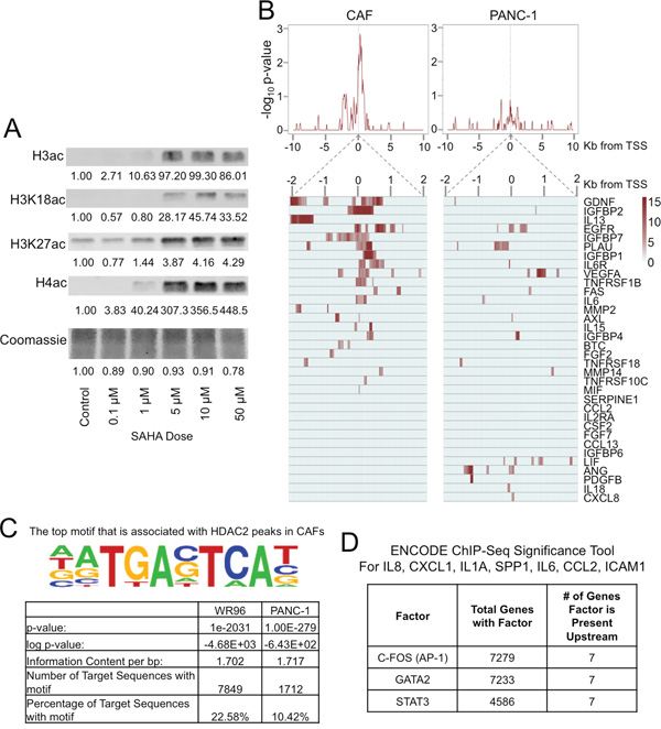 Figure 4: HDAC inhibition causes histone hyperacetylation in CAFs. A. Near-infrared western blots of histone extracts of PDAC CAFs treated at various doses of SAHA for 24h. Quantitative near-infrared fluorescent western blots were performed using the LI-COR Odyssey Fc imaging system with densitometry measurements were performed relative to untreated control cell blots are reported. B. HDAC2 ChIP-Seq was performed in primary PDAC CAFs and PANC-1 TCs. Average profile Distribution of HDAC2 binding ± 10 Kb from the transcription start site (TSS) of pro-inflammatory genes (top) and heat map of HDAC2 distribution ± 2.5 Kb from the TSS (below) of individual pro-inflammatory genes using significant peaks (P = 104 over three 50 bp windows). C. Transcription factor binding motif analysis using HOMER (Hypergeometric Optimization of Motif EnRichment). The top motif identified with HDAC2 peaks in CAFs was found to be associated with AP-1 transcription factor as displayed (P = 1.0 x 10-2031). This motif was present in 22% of HDAC2 peak sequences in fibroblasts. D. Factors bound to chromatin common among 7 pro-inflammatory genes within 5,000 base pairs of the transcription start site of these genes were identified using the ENCODE ChIP-Seq Significance Tool (q < 0.05). STAT3, C-FOS (a component of the AP-1 heterodimer), and GATA2 were found to commonly bind in gene regulatory regions in the vicinity of the TSS of all 7 genes.