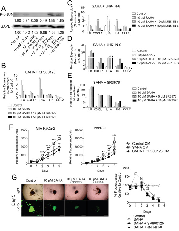 Figure 5: Chemical inhibition of JNK suppresses tumor supportive effects of HDACi in CAFs. A. PDAC CAFs were treated with SAHA +/- various JNK inhibitors and western blots for P-c-JUN and GAPDH was performed of cell lysates with measurements of relative densitometry reported below blot signals. qRT-PCR was performed of PDAC CAFs treated with SAHA and various doses of B. SP600125, C. JNK-IN-8, D. JNK-IN-9, or E. SR3576. F. Fluorescence measurements of GFP-expressing MIA PaCa-2 (left) and PANC-1 (right) cells grown in conditioned media (without drug) from i) naïve CAFs or ii-iii) CAFs pretreated with 10 μM SAHA+/- 50 μM SP600125. T-tests were performed to compare 10 μM SAHA CM and 10 μM SAHA + 50 μM SP600125 CM groups (**P < 0.01, ***P < 0.001). G. PANC-1-GFP / CAF 3D co-cultures were treated with SAHA +/- JNK inhibitors: 50 μM SP600125 or 10 μM JNK-IN-8 and fluorescence measurements were performed daily (4X; scale: 300 μm).