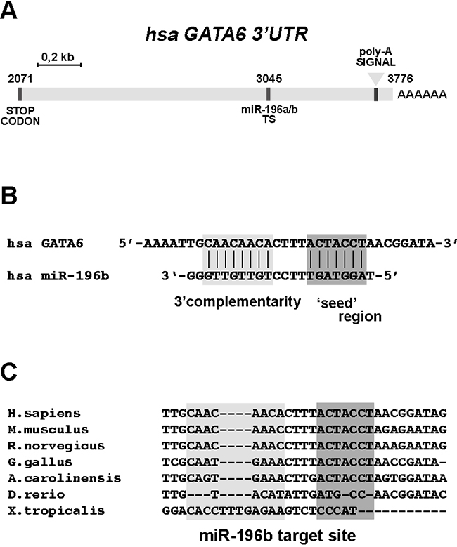Figure 2: The 3’UTR sequence of GATA6 contains a conserved miR-196b target site. A. Schematic representation of the human GATA6 3’ untranslated (3’UTR) region. Sequence positions are indicated, considering ‘+1’ the transcriptional start site (TSS) of the GATA6 transcript. TS, miR-196b target site. B. Interaction between miR-196b and the target site annotated on the 3’UTR of GATA6, as predicted by Targetscan software. C. Sequence comparison of the miR-196b target site. Dark grey boxes indicate the interaction mediated by the seed-region whereas the light rectangle indicates an additional pairing site driven by the 3’ half of miR-196b. The indicated species are: Homo sapiens, Mus musculus, Rattus norvegicus, Gallus gallus, Anolis caroliniensis, Danio rerio, Xenopus tropicalis.