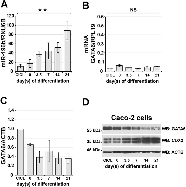 miR-196b expression increases upon colon cell differentiation concomitantly with a decrease of GATA6 protein levels