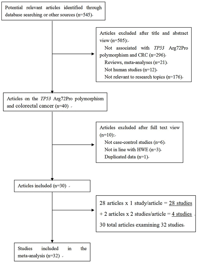 Our search strategy yielded a total of 545 records, which were screened to identify original research articles pertaining to TP53 and CRC. The literature search and detailed selection procedures are summarized in Figure 1. After the primary screening, the full text of 40 articles was retrieved for further assessment [10–49]. Ten of those articles were then excluded from further analysis: 6 were not case-control studies [40–45], 1 was based on duplicate data from another eligible study [46], and 3 reported a genotype distribution among the controls that was not in Hardy-Weinberg equilibrium (HWE) [47–49]. Two of the articles reported 2 studies each [19, 24]. Thus, 1 study in each of 28 articles and 2 studies in each of 2 articles, adds up to a total of 32 studies in 30 articles [10–39]. In these 32 studies that conformed to our inclusion criteria, there were 8586 CRC cases and 10275 controls. Fourteen studies involved Asian participants, 12 involved Caucasians, and 6 involved mixed populations. The population characteristics of the included studies are shown in Table 1.