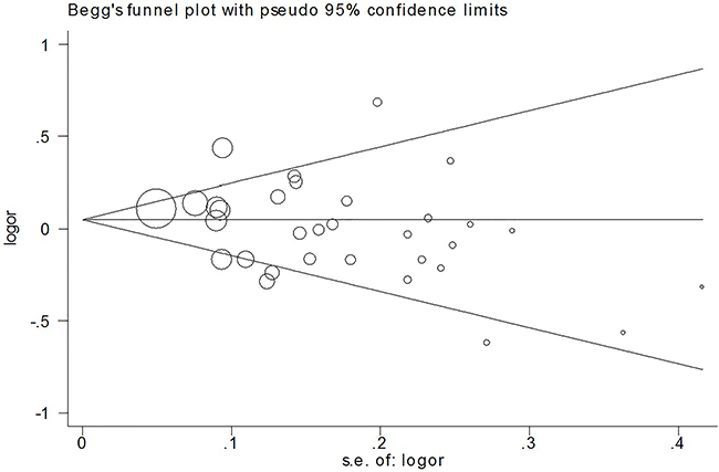We used Begg’s funnel plot and Egger’s test to assess the publication bias of the published articles. The symmetrical funnel plot for the allele model shown in Figure 3 suggests the findings of our meta-analysis were not affected by publication bias. The Egger’s test results also did not suggest the existence of publication bias, as indicated by P values greater than 0.05 (P=0.098 for the allele model). The influence of each individual study on the pooled OR was assessed by performing the analysis while deleting one study at a time. Because the OR was not significantly influenced by omitting any single study (data not shown), we conclude our data are relatively stable and credible.
