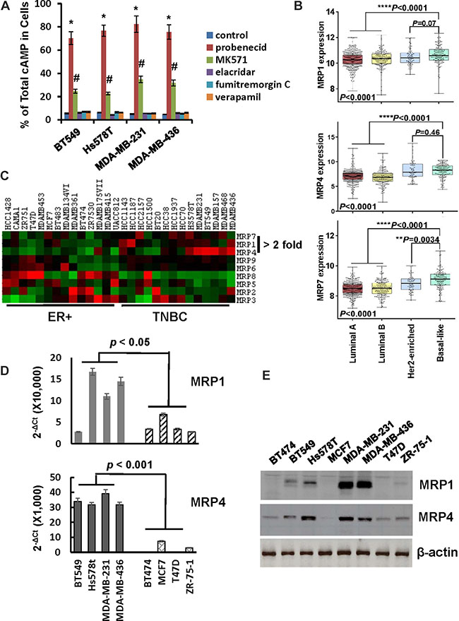 Figure 3: Expression of MRP1 and MRP4 is elevated in TNBC cells. (A) MDA-MB-231 and MDA-MB-436 cells were pretreated with 1 mM probenecid, 50 μM MK571, 0.5 μM elacridar hydrochloride, 10μM fumitremorgin C or 100 μM verapamil for 1 h and then incubated with 10 μM forskolin and 100 μM IBMX for 1 h. Cells and media were collected and analyzed for levels of cellular and secreted cAMP respectively. Data are means ± SD (n = 3). *P < 0.001 vs control; #P < 0.01 vs control. (B) Box-and-whisker plot was generate to show the expression of MRP1, MRP4 and MRP7 in breast tumor subtypes. (C) Heat map was generated to reveal the expression of MRP family members in established ER+ and TNBC cell lines. (D) QRT-PCR of MRP1 and MRP4 mRNA in breast cancer cell lines. Level of β-actin mRNA was used as an internal control for standardization. Data are means ± SD (n = 3). (E) Overnight-cultured cells were lysed and cell lysates were subjected to western blotting to detect MRP1, MRP4 and β-actin with the respective antibodies.