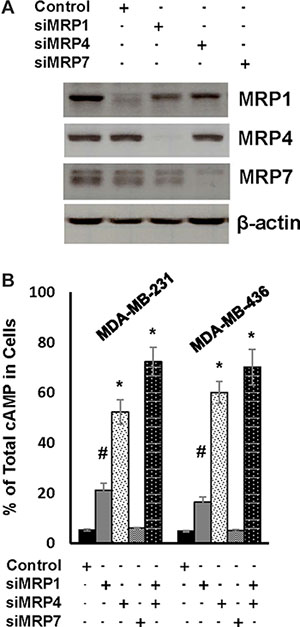 Figure 4: MRP1 and MRP4 facilitate rapid cAMP diminution in TNBC cells. (A) MDA-MB-231 cells were transfected with control siRNA, MRP1, MRP4 or MRP7 siRNA pool for 4 days and then lysed for western blotting to detect MRP1, MRP4, MRP7 or β-actin with the respective antibodies. (B) MDA-MB-231 and MDA-MB-436 cells were transfected with control siRNA, MRP1, MRP4 or MRP7 siRNA pool for 4 days followed by 1-h treatment of 10 μM forskolin and 100 μM IBMX. Cells and media were collected and analyzed for the amount of cellular and secreted cAMP respectively. Data are means ± SD (n = 3). *P < 0.01 vs control siRNA.