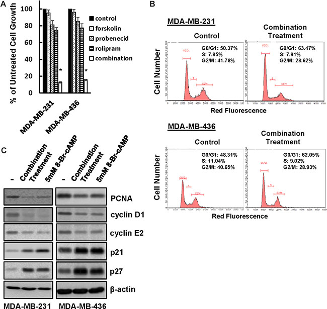 Figure 6: Co-treatment of forskolin, probenecid and rolipram leads to TNBC cell growth arrest. (A) MDA-MB-231 and MDA-MB-436 cells were treated with 10μM forskolin, 500 μM probenecid and 3 μM rolipram alone or together for 4 days followed by MTT assay to determine cell growth. Data are means ± SD (n = 4). *P < 0.001 vs control. (B) MDA-MB-231 and MDA-MB-436 cells were co-treated with forskolin, probenecid and rolipram or left untreated for 1 day followed by flow cytometry to analyze cell cycle. (C) MDA-MB-231 and MDA-MB-436 cells were treated with the combination of forskolin, probenecid and rolipram or 5 mM 8-Br-cAMP or left untreated for 1 day, then lysed and cell lysates were subjected to western blotting to detect cyclin D1, cyclin E2, PCNA, p21, p27 and β-actin with the respective antibodies.