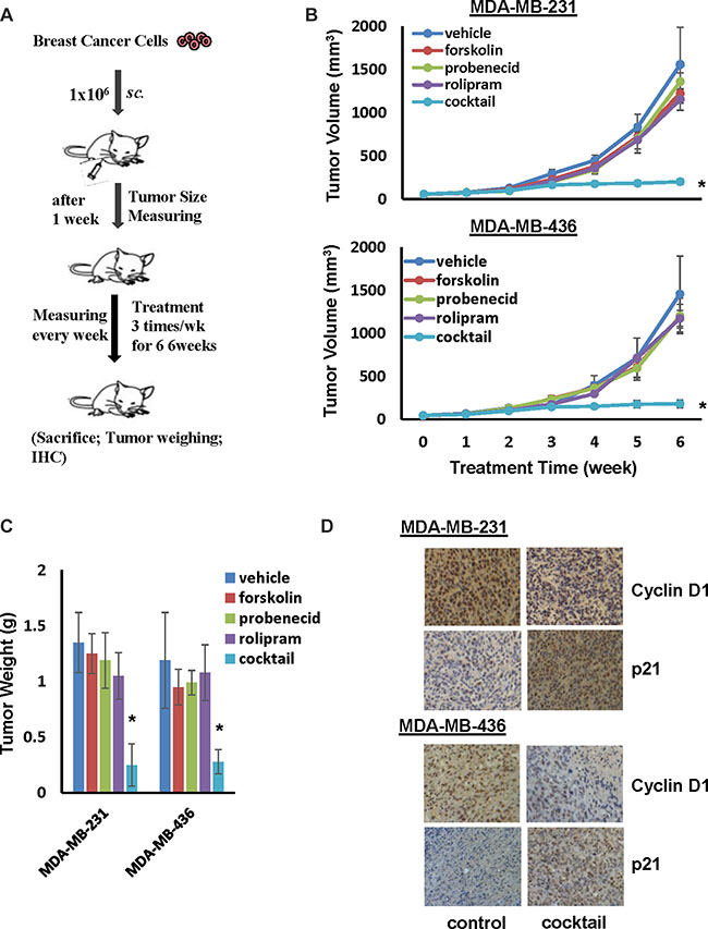 Figure 7: Cocktail of forskolin, probenecid and rolipram suppresses tumor outgrowth of TNBC cells. (A) Flow chart of therapy scheme. (B) MDA-MB-231 or MDA-MB-436 cells (106 cells/mouse) were injected to nude mice for 1 week followed by administering 5mg/kg forskolin, 125 mg/Kg probenecid and 2 mg/ml roliproam alone or together. Tumor development was determined by measuring tumor volume weekly. Data are means ± SD (n = 6). *P < 0.01 vs vehicle control. (C) Weight of tumors excised from mice at the end of treatment. Data are means ± SD (n = 6). *P < 0.01 vs vehicle control. (D) Representative pictures of IHS staining of cyclin D1 and p21 in tumor tissues.
