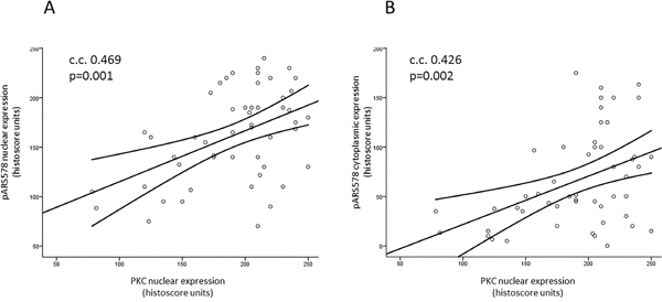 Figure 2: Scatter plots illustrating the correlation of PKC nuclear expression with pARS578 nuclear A. and cytoplasmic B. expression. Line represents best fit line with mean 95% confidence intervals. Pearson’s correlation coefficient (c.c.) >0.4 and p<0.05 is considered significant.