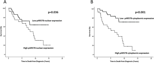 Figure 3: Kaplan-Meier survival plots illustrating disease-specific survival in patients with high (dashed line) and low (solid line) nuclear A. and cytoplasmic B. pARS578 expression.