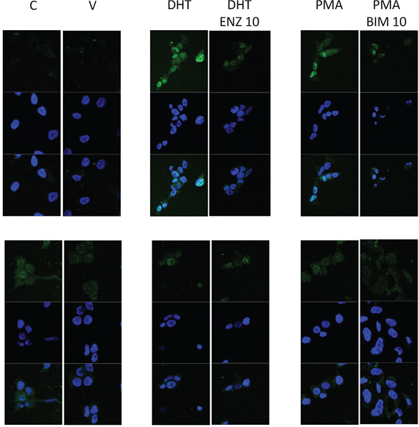 Figure 5: Immunofluorescent image demonstrating that nuclear translocation of AR in response to DHT or PMA can be inhibited by enzalutamide and BIM and nuclear translocation of AR578 in response to PMA can be inhibited by BIM.
