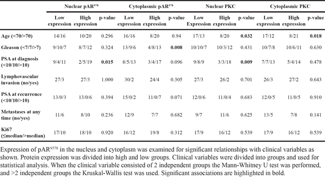 The current study demonstrates that phosphorylation of AR at Ser-578 is strongly associated with PKC expression. In addition, the expression of pARS578 in hormone-naïve prostate cancer was observed to be a negative prognostic marker associated with shorter time to biochemical relapse, decreased survival from biochemical relapse and decreased disease-specific survival. Although we were unable to demonstrate any significant association between pPKC expression and clinico-pathological outcome measures, there was a trend towards significance between high expression of both nuclear and cytoplasmic pPKC and increased Gleason score (p=0.09 and p=0.103 respectively).