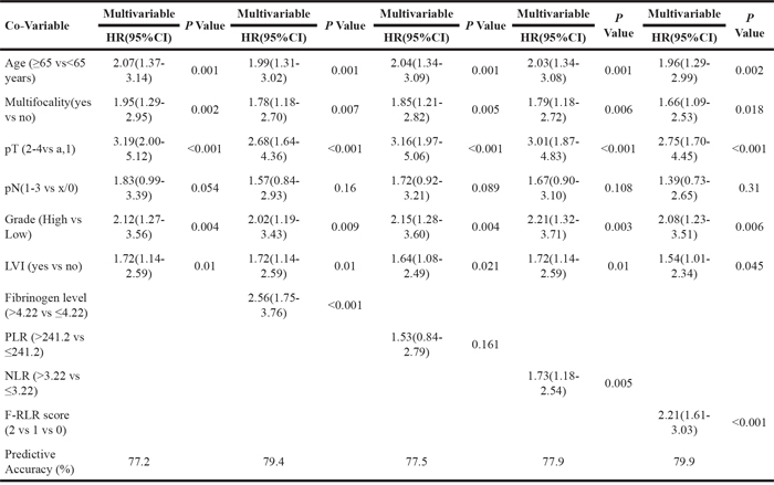 The predictive accuracy was calculated with and without the inclusion of fibrinogen, PLR, NLR and F-PLR score. In the base model, including the traditional predictor variables of age, tumor multifocality, pT stage, pN stage, higher grade and LVI, predictive accuracy for CSS was 77.2%; with the addition of fibrinogen, predictive accuracy was 79.4%; with the addition of PLR, predictive accuracy was 77.5%, with the addition of NLR, predictive accuracy was 77.9%, with the addition of F-PLR score, predictive accuracy was 79.9% (Table 4). As to OS, we observed similar results, in the base model, including the traditional predictor variables of age, tumor multifocality, pT stage, pN stage, higher grade and LVI, predictive accuracy was 75.6%; with the addition of fibrinogen, predictive accuracy was 77.6%; with the addition of PLR, predictive accuracy was 75.8%, with the addition of NLR, predictive accuracy was 75.8%, with the addition of F-NLR score, predictive accuracy was 78.4% (Table 5).