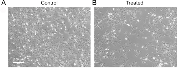 Figure 1: Morphology of Du145 cells treated with or without TGF-β. After 2 weeks of treatment cells showed an elongated mesenchymal-like appearance. Pictures were taken by phase contrast microscopy.