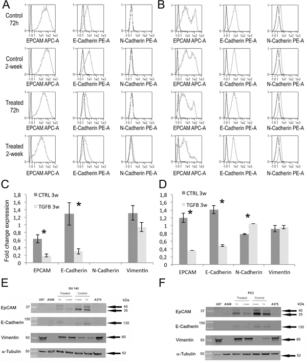 In Du145 and PC3, western blots demonstrated a decrease of EPCAM and E-Cadherin expression and an increase of Vimentin both after 72h and 2-weeks (Figure 2E, 2F). Western blots definitely demonstrated EMT showing the expected EPCAM and E-cadherin signal reduction alongside with vimentin increase.